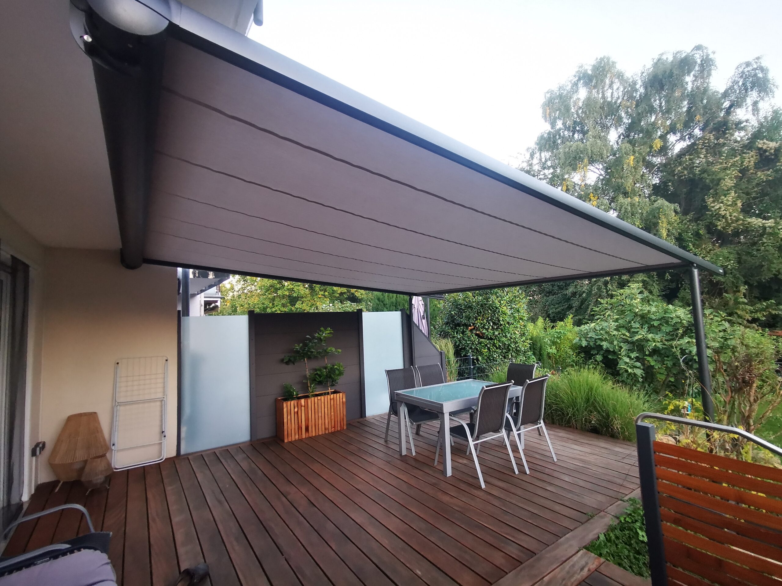 Je nach Modell können bis zu 7 Meter Ausfall realisiert werden. Es können auch mehrere Felder nebeneinander realisiert werden, sodass im ganzen eine enorm große Fläche beschattet werden kann.