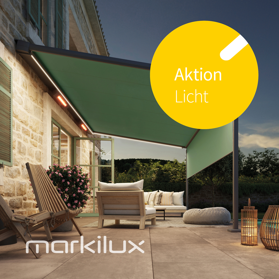 Während der Aktionswoche werden wir auch die neue Markilux Frühlingsaktion vorstellen. Mit der diesjährigen “Aktion Licht” können Sie sich im Zeitraum vom 20.03. – 30.06.2023 exklusive Preisvorteile auf die Lichtoptionen unserer Erfolgsmodelle markilux 6000, pergola classic und pergola cubic sichern. Fragen Sie uns.